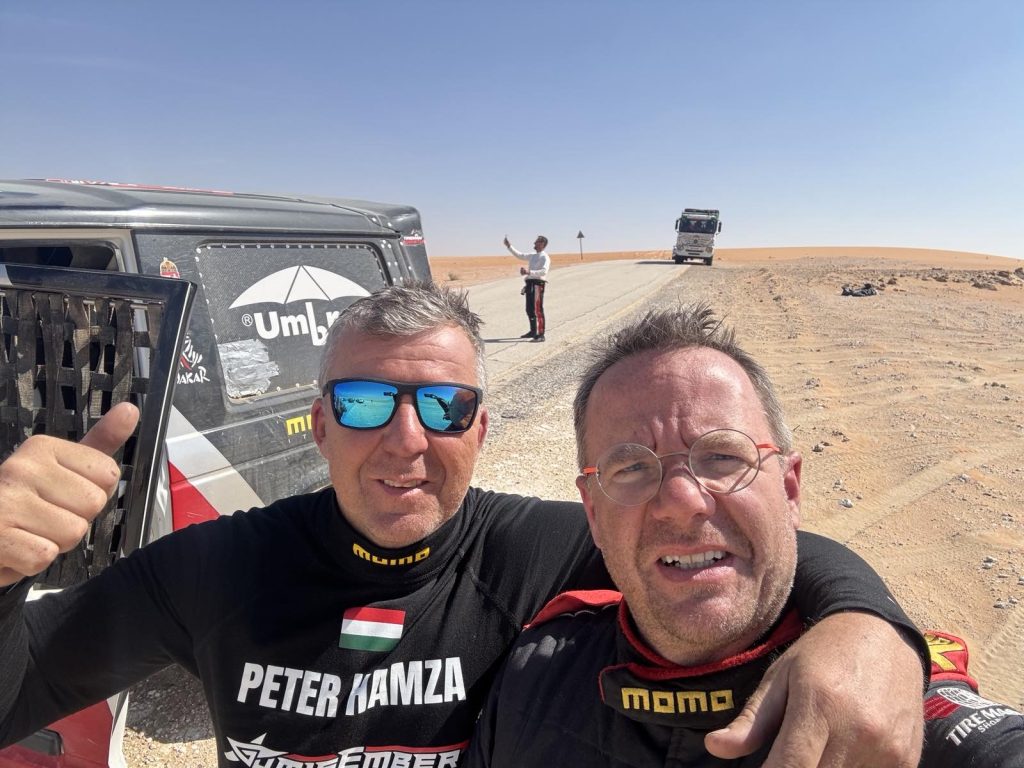 Due to their tight budget, Tireman Racing entered the 2025 Dakar Cassic without a service crew or motorhome. Rivals predicted they would last no more than one or two days. But Péter and András, proved them wrong: Driving 500–800 kilometers per day, repairing the car at night, and sleeping in a small tent beside their vehicle. While factory teams had coaches, masseurs, mental trainers, and huge support trucks, the they had only had each other. There were days when they finished as high as 9th out of a 100-car field. On the penultimate stage, disaster struck: the Pajero rolled in the dunes, stopped on its nose, and caught fire. Péter broke his leg and ribs – but they refused to give up. That night, they rebuilt the car, and with painkillers, they crossed the final finish line. In the end, even the doubters stood and applauded. They finished 19th in the Classic H2 category.